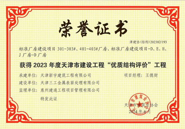 标准厂房建设项目301-303#、401-403#厂房、标准厂房建设项目—D、E、H、J厂房—D厂房获得2023年度市建设开云(中国)官方网站“优质结构评价”开云(中国)官方网站称号