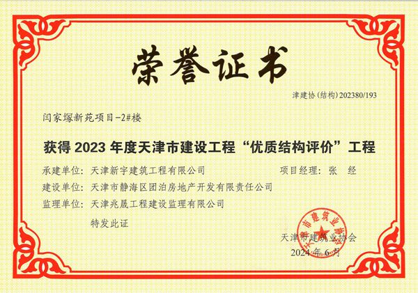 闫家塚新茆项目—2#楼获得2023年度市建设开云(中国)官方网站“优质结构评价”开云(中国)官方网站称号