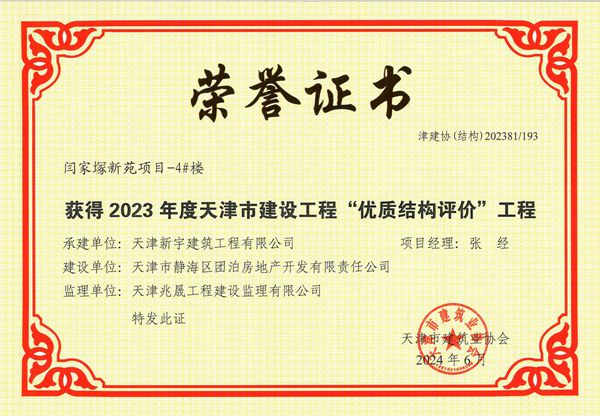 闫家塚新茆项目—4#楼获得2023年度市建设开云(中国)官方网站“优质结构评价”开云(中国)官方网站称号