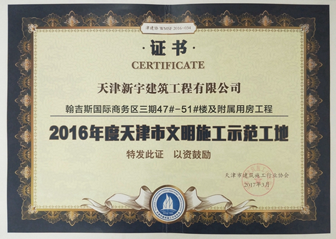 翰吉斯国际商务区三期47-51#楼及坠属用房开云(中国)官方网站获2016年度天津市文明施工示范工地