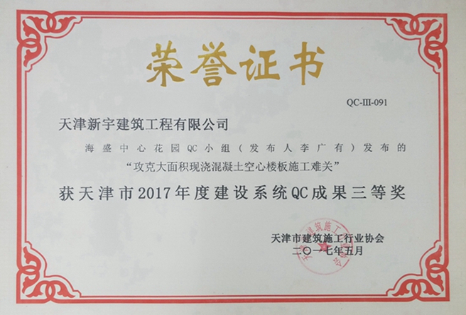 获天津市2017年度建设系统QC成果三等奖