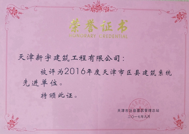 我公司被评为2016年度天津市区县建筑系统先进单位