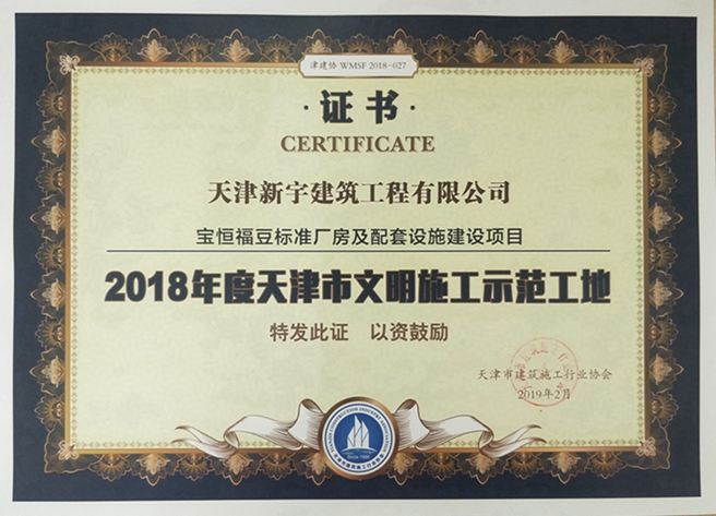宝恒福豆标准厂房及配套设施建设项目获2018年度天津市文明施工示范工地