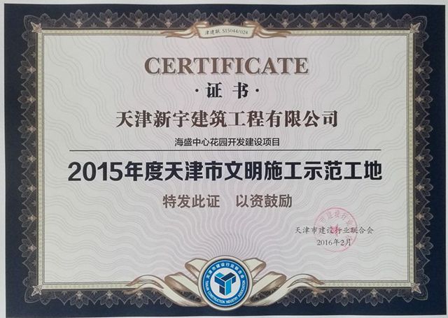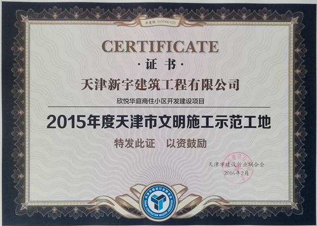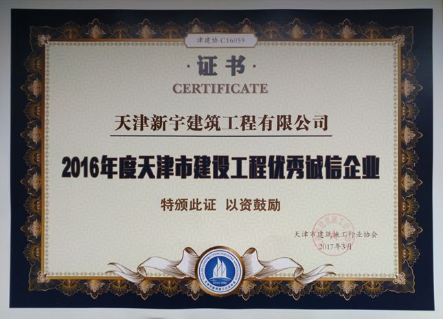 2016年天津市建设开云(中国)官方网站优秀诚信企业